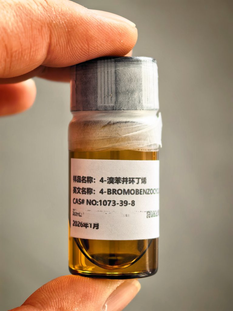 4-BrBCB是一种无色至淡黄色液体,分子式C₈H₇Br,分子量183.05,密度约1.47 g/mL(25°C),折射率n²⁰/D ≈1.589,沸点118-119°C(20 Torr)。其结构为苯环与四元环稠合,4位引入溴原子,使其具备高度反应活性。溴原子可发生亲核取代、消除、Suzuki/Heck偶联等多种反应,是理想的“把手”基团。
