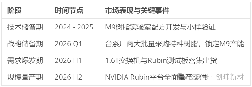1. 节奏明确:M9材料的验证已于2025年底完成,2026年Q1进入库存储备期,2026年H2随Rubin平台量产全面爆发 。