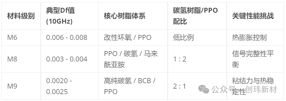 这种性能的提升并非简单的工艺改良,而是涉及到了树脂基体化学结构的根本性重构。为了实现更低的极化率和更稳定的高频响应,M9系统大幅增加了高纯度、高性能碳氢树脂的比例。在M8和M8.5代际中,碳氢树脂与聚苯醚(PPO/PPE)的配比通常为1:2,而在进入M9阶段后,这一比例正在向2:1甚至更高转化 4。碳氢树脂凭借其优异的非极性特征,能够提供比PPO更优的介电频率稳定性,但也对材料的粘结力、耐热性和加工性能提出了新的挑战。